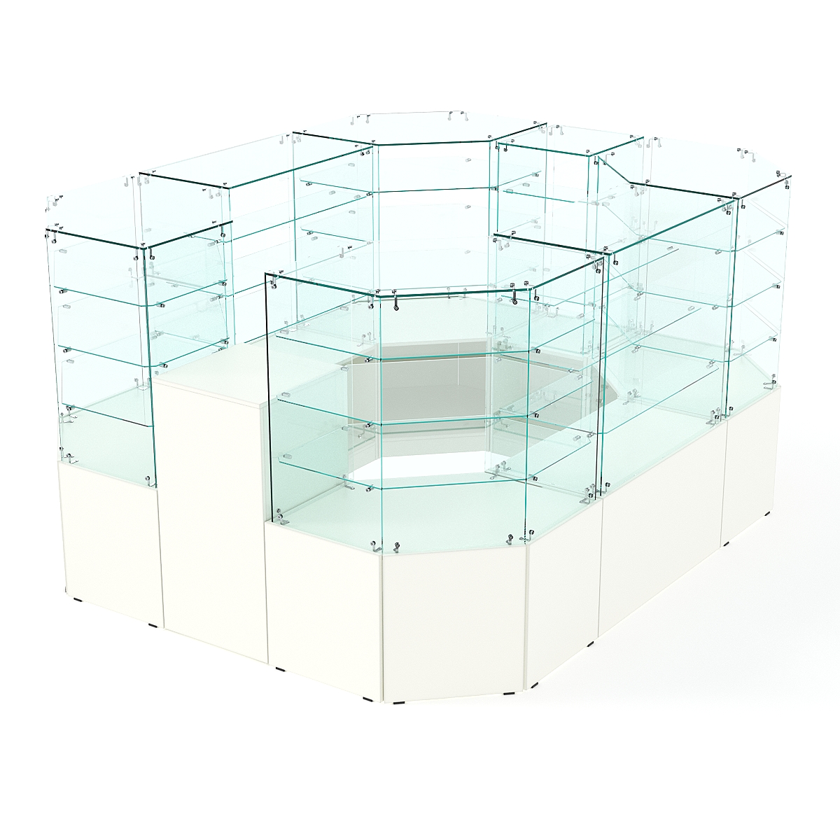 Данная модель предназначена для расположения в центре зала, имеет прямоугольную форму и просматривается с 4-х сторон. Со стороны продавца витрины открытые. Такое оборудование можно установить в торговом центре.