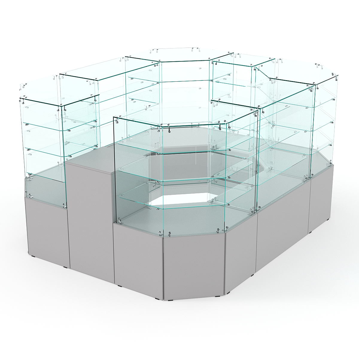Данная модель предназначена для расположения в центре зала, имеет прямоугольную форму и просматривается с 4-х сторон. Со стороны продавца витрины открытые. Такое оборудование можно установить в торговом центре.