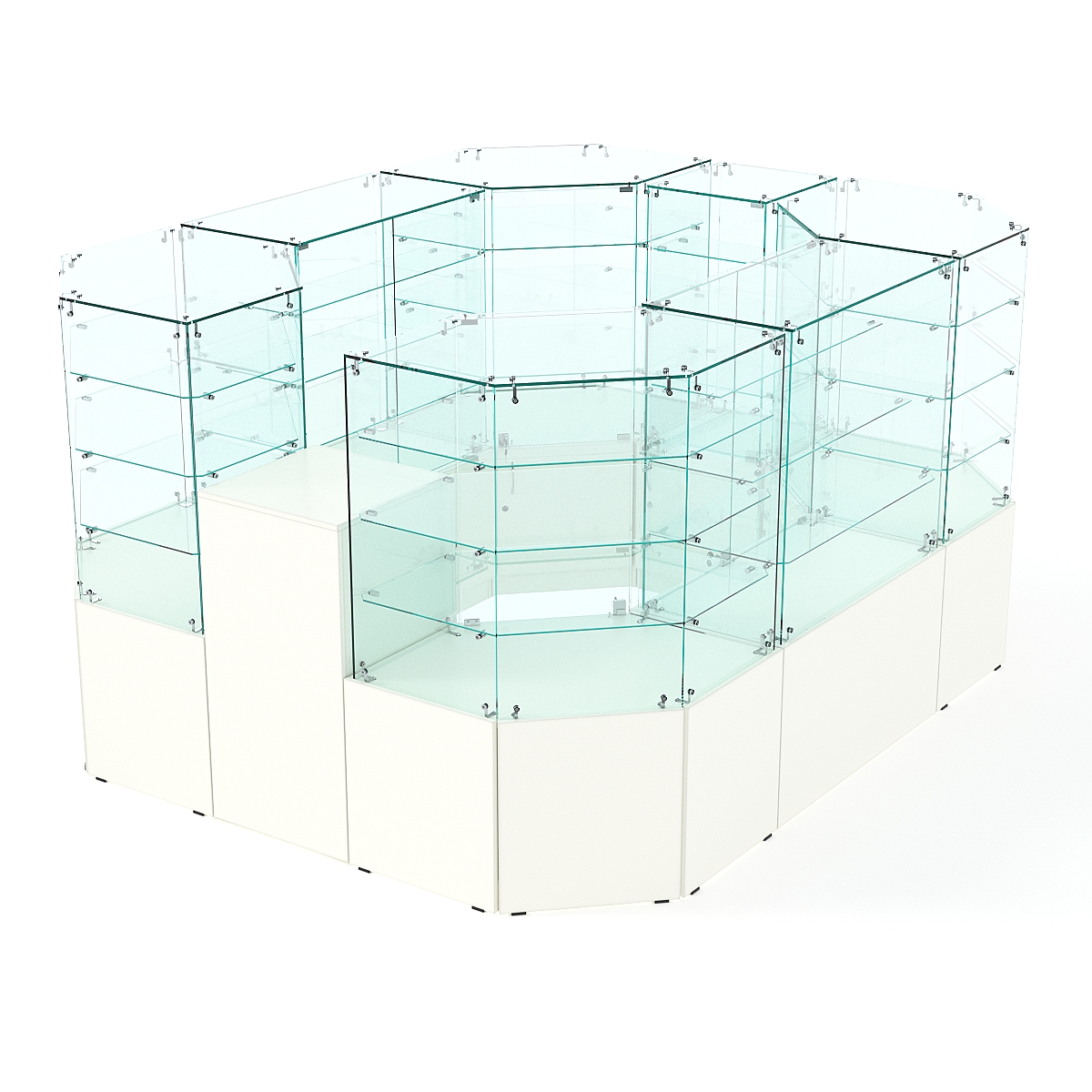 Данная модель предназначена для расположения в центре зала, имеет прямоугольную форму и просматривается с 4-х сторон. Со стороны продавца витрины закрытые. Такое оборудование можно установить в торговом центре.