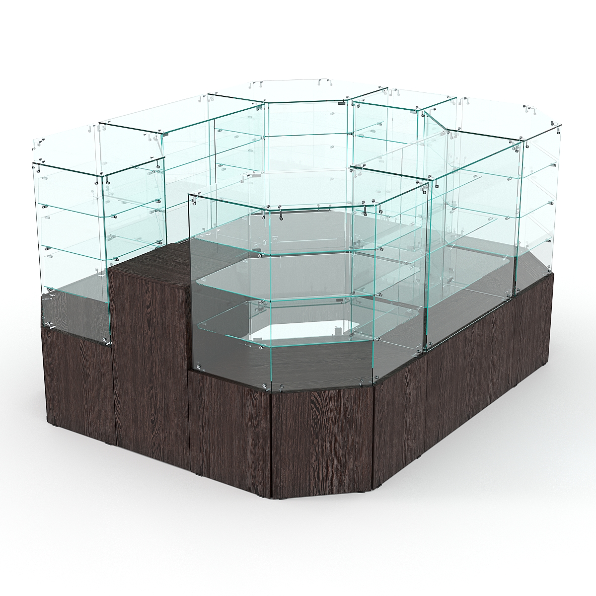 Данная модель предназначена для расположения в центре зала, имеет прямоугольную форму и просматривается с 4-х сторон. Со стороны продавца витрины закрытые. Такое оборудование можно установить в торговом центре.
