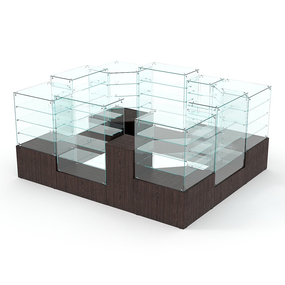 Данная модель предназначена для расположения в центре зала, имеет прямоугольную форму и просматривается с 4-х сторон. Со стороны продавца витрины открытые. Такое оборудование можно установить в торговом центре.