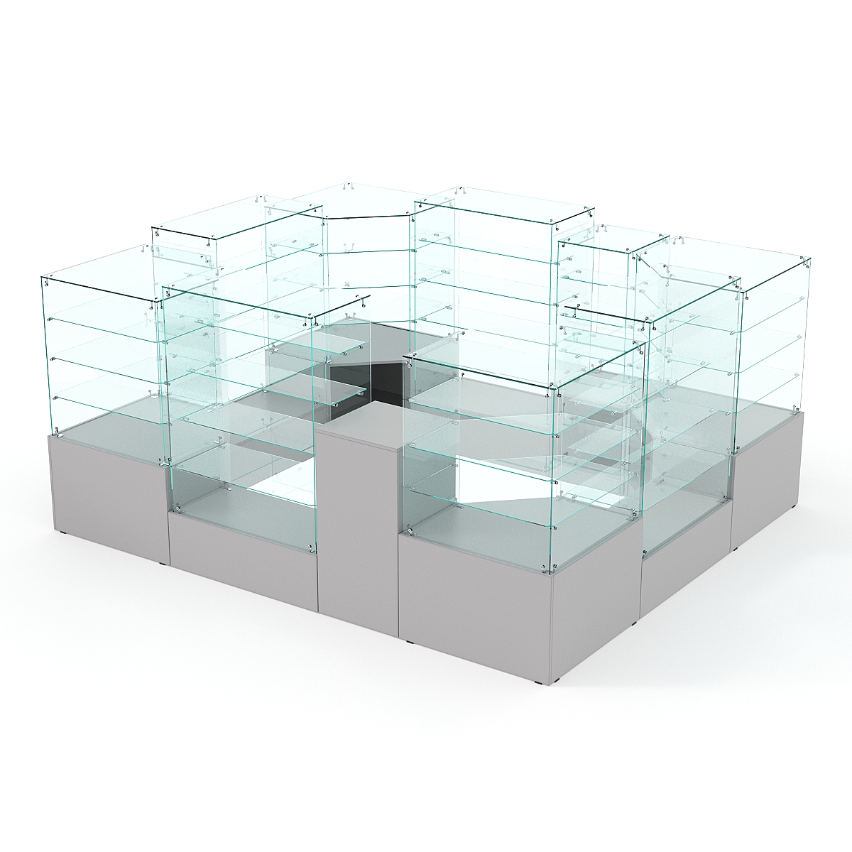 Данная модель предназначена для расположения в центре зала, имеет прямоугольную форму и просматривается с 4-х сторон. Со стороны продавца витрины открытые. Такое оборудование можно установить в торговом центре.