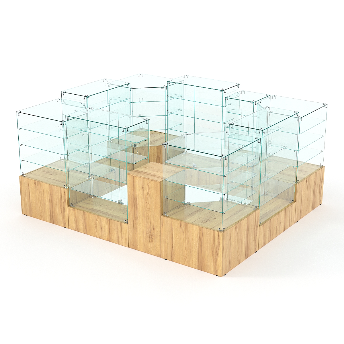 Данная модель предназначена для расположения в центре зала, имеет прямоугольную форму и просматривается с 4-х сторон. Со стороны продавца витрины закрытые. Такое оборудование подойдет для установки в торговом центре.