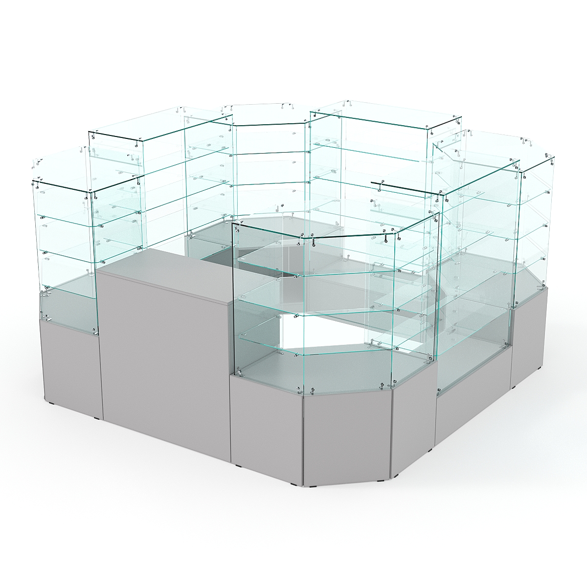 Данная модель предназначена для расположения в центре зала, имеет прямоугольную форму и просматривается с 4-х сторон. Со стороны продавца витрины открытые. Такое оборудование можно установить в торговом центре.