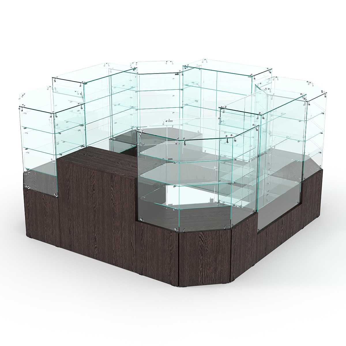 Данная модель предназначена для расположения в центре зала, имеет прямоугольную форму и просматривается с 4-х сторон. Со стороны продавца витрины закрытые. Такое оборудование можно установить в торговом центре.