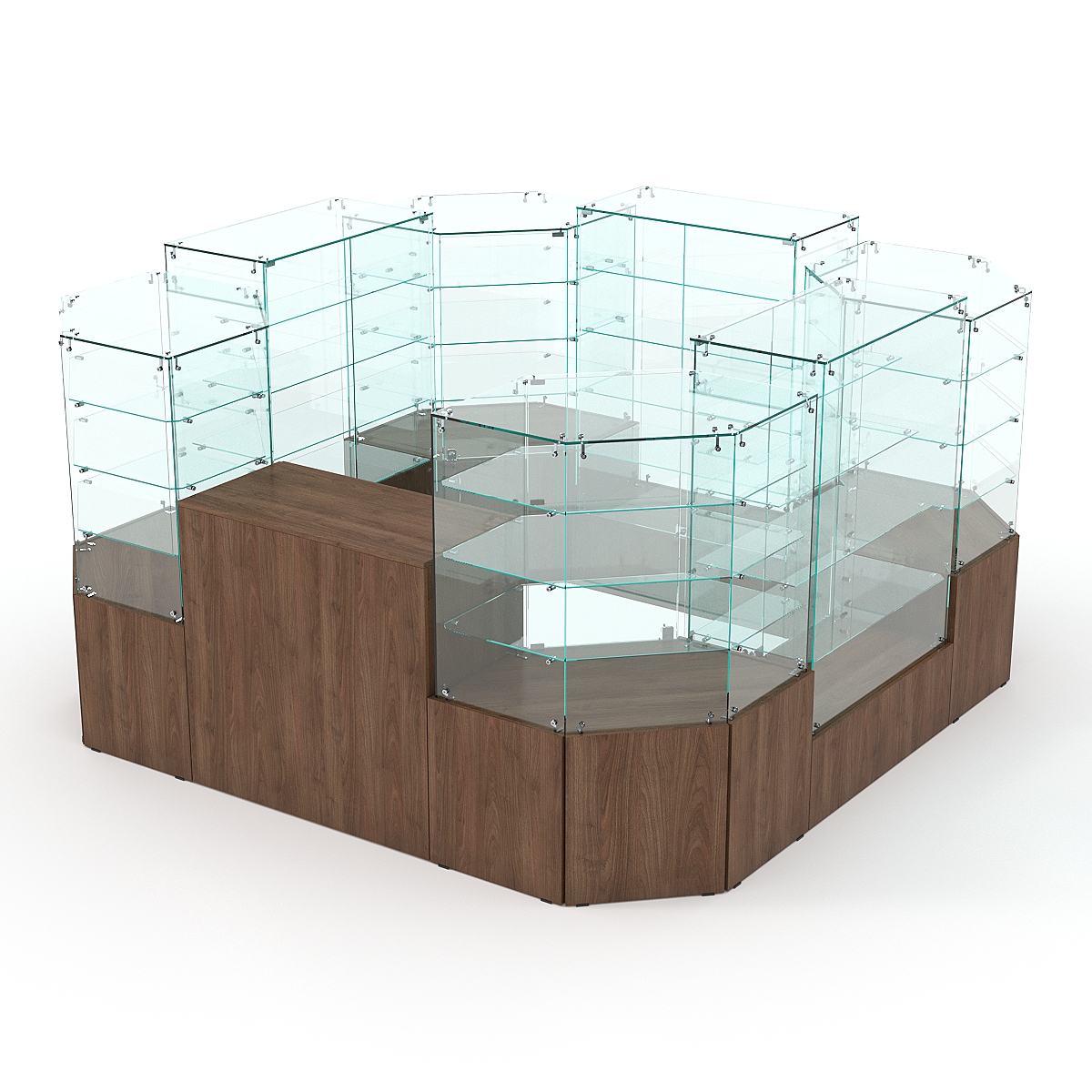 Данная модель предназначена для расположения в центре зала, имеет прямоугольную форму и просматривается с 4-х сторон. Со стороны продавца витрины закрытые. Такое оборудование можно установить в торговом центре.