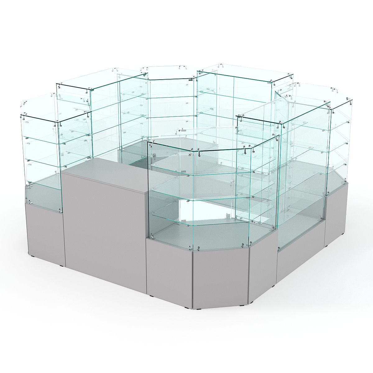 Данная модель предназначена для расположения в центре зала, имеет прямоугольную форму и просматривается с 4-х сторон. Со стороны продавца витрины закрытые. Такое оборудование можно установить в торговом центре.