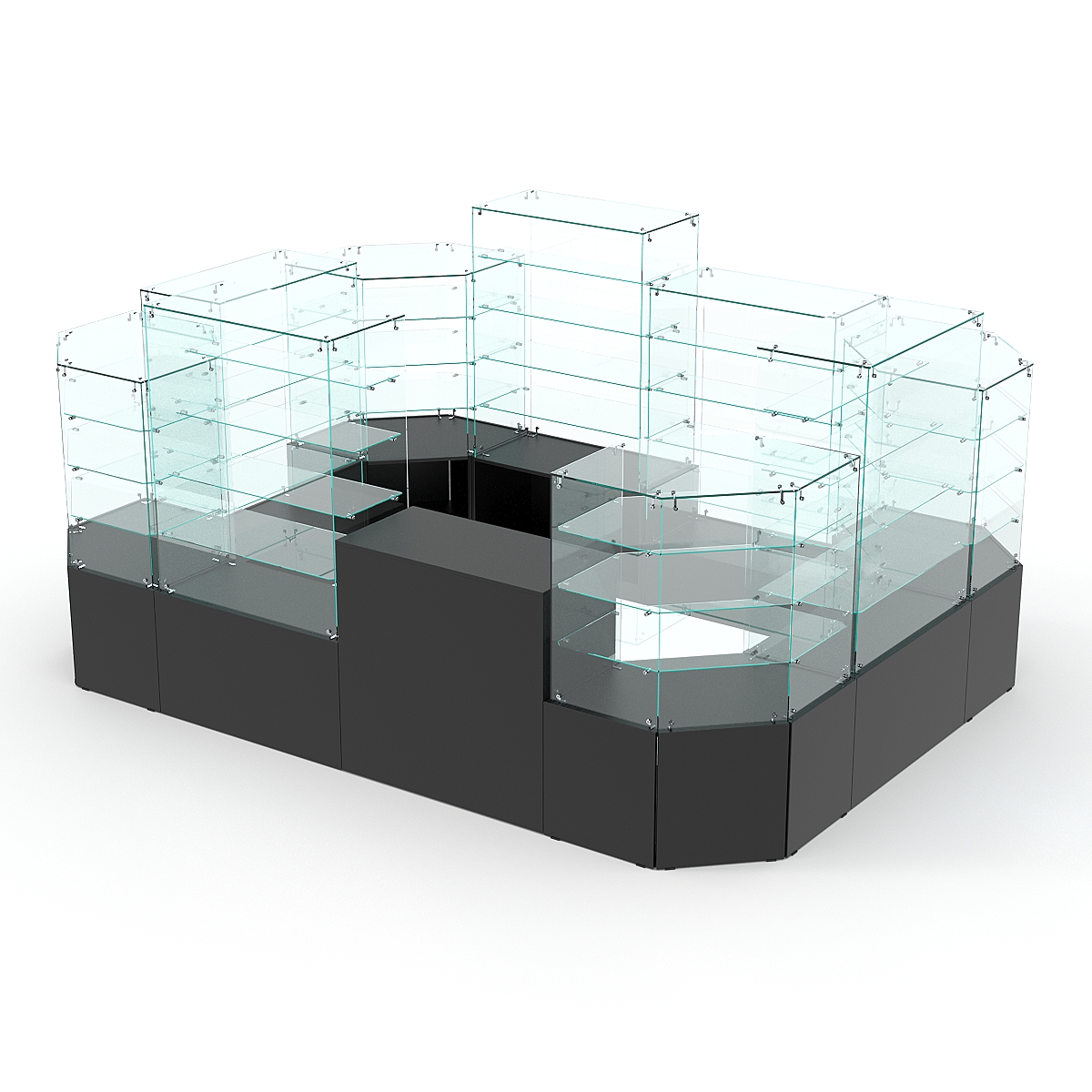 Данная модель предназначена для расположения в центре зала, имеет прямоугольную форму и просматривается с 4-х сторон. Со стороны продавца витрины открытые. Такое оборудование можно установить в торговом центре.