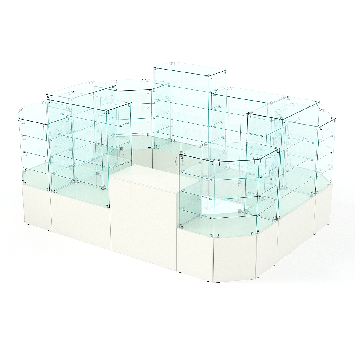 Данная модель предназначена для расположения в центре зала, имеет прямоугольную форму и просматривается с 4-х сторон. Со стороны продавца витрины закрытые. Такое оборудование можно установить в торговом центре.