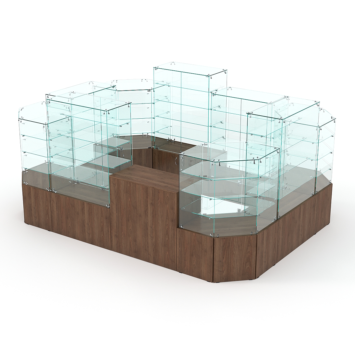 Данная модель предназначена для расположения в центре зала, имеет прямоугольную форму и просматривается с 4-х сторон. Со стороны продавца витрины закрытые. Такое оборудование можно установить в торговом центре.