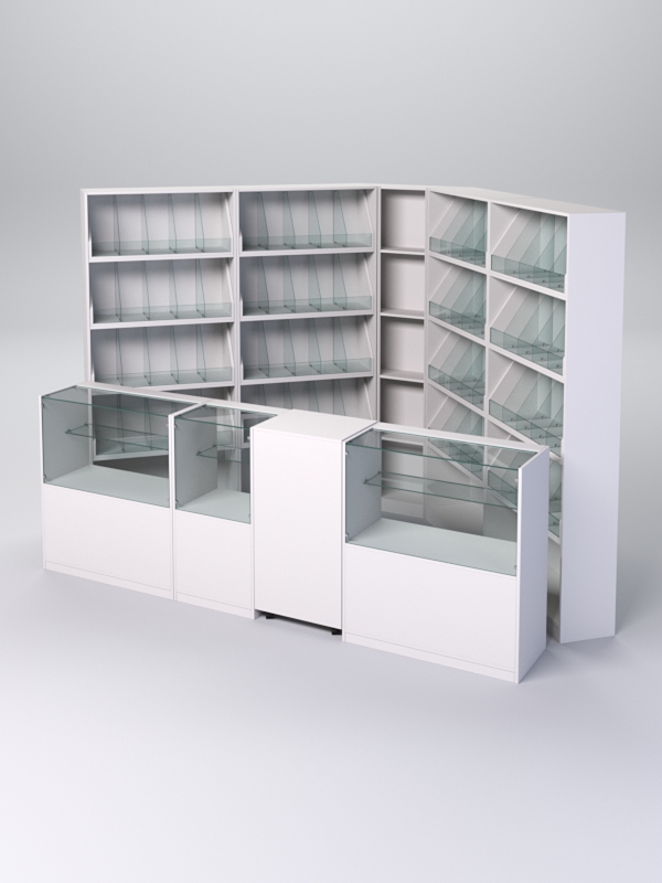Данная модель имеет прямоугольную форму, состоит из 4 стеллажей с разделителями под сыпучие товары, 1 углового стеллажа, 3 прилавков, и тумбы кассира.