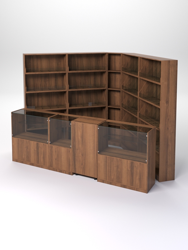 Данная модель имеет прямоугольную форму, состоит из 4 стеллажей с разделителями под сыпучие товары, 1 углового стеллажа, 3 прилавков, и тумбы кассира.
