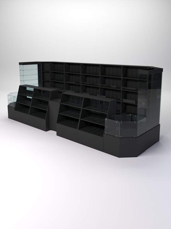 Данная модель имеет прямоугольную форму, состоит из 5 стеллажей с разделителями под сыпучие товары, 2 угловых стеллажей, 4 прилавков со скошенными боковинами, и тумбы кассира, углового прилавка, и высокой витрины.