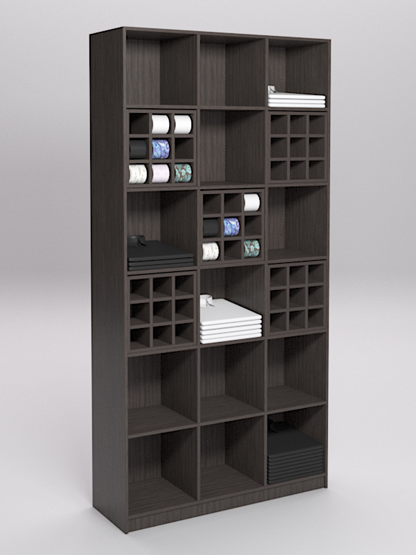 Стеллаж состоит из 18 секций: 13 секций для рубашек и 5 секций — для галстуков. Каждая секция для галстуков имеет 9 ячеек.