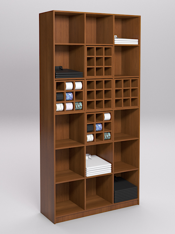 Стеллаж состоит из 18 секций: 13 секций для рубашек и 5 секций — для галстуков. Каждая секция для галстуков имеет 9 ячеек.