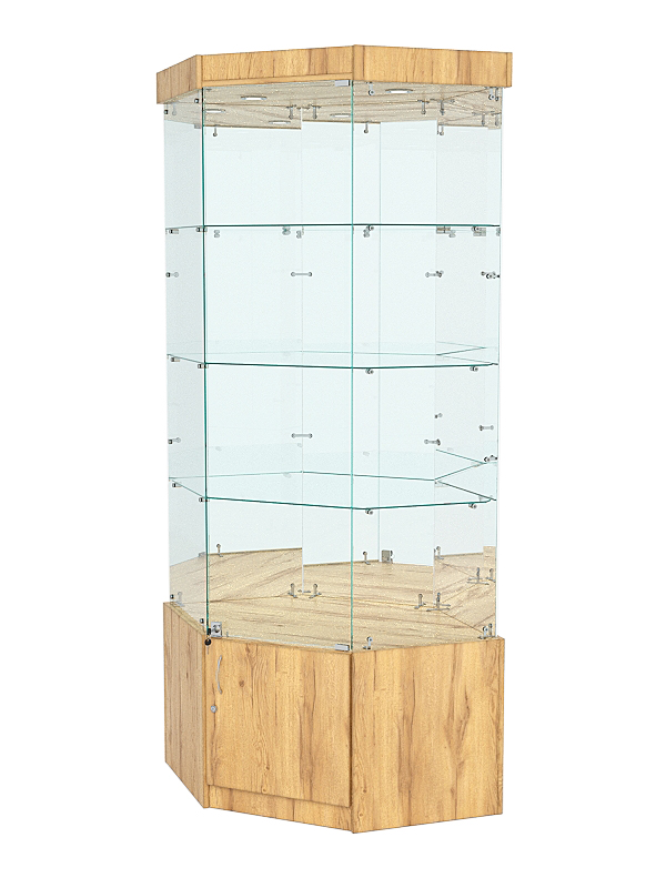 Витрина стеклянная "ИСТРА" угловая №19 шестигранная (с дверкой, задняя стенка — зеркало), Дуб Золотистый