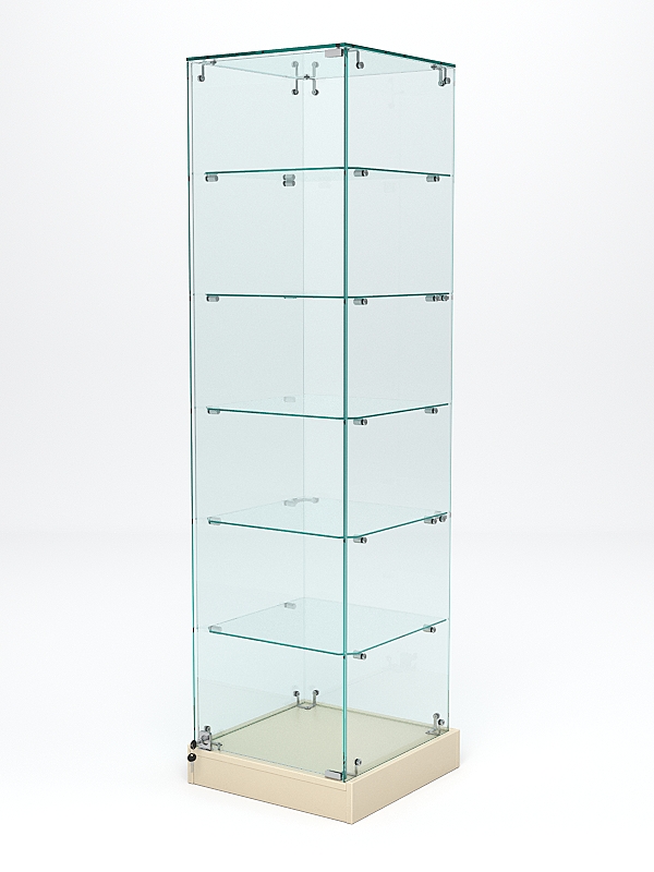 Витрина из стекла — это торговое оборудование которое может использоваться в магазине, торговом комплексе или музее. В нижней части — квадратный подиум. Модель оснащена пятью полками. Материал — ЛДСП и стекло.