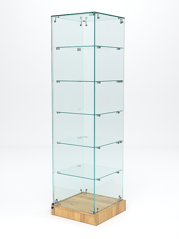 Витрина из стекла — это торговое оборудование которое может использоваться в магазине, торговом комплексе или музее. В нижней части — квадратный подиум. Модель оснащена пятью полками. Материал — ЛДСП и стекло.