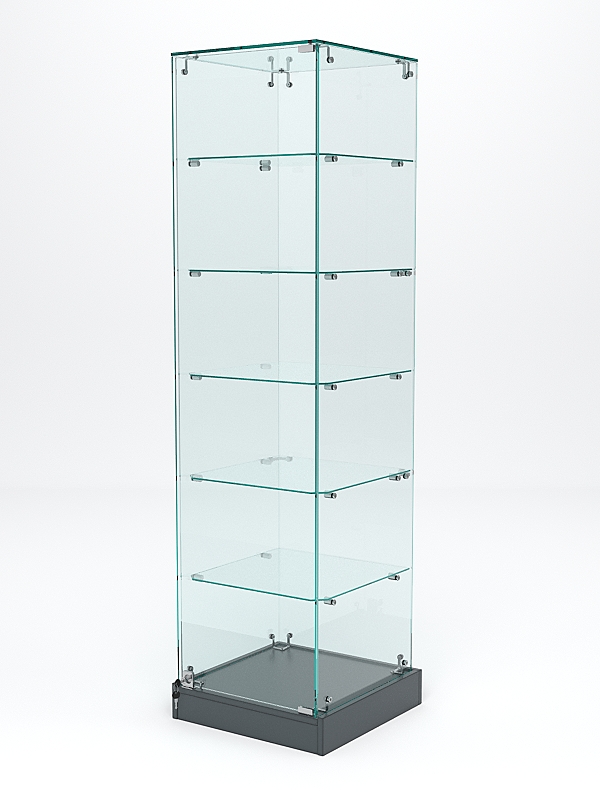 Витрина из стекла — это торговое оборудование которое может использоваться в магазине, торговом комплексе или музее. В нижней части — квадратный подиум. Модель оснащена пятью полками. Материал — ЛДСП и стекло.