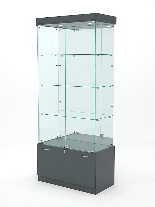 В верхней части оснащена подсветка. Подсветка в стеклянной витрине используется для привлечения внимания потенциальных покупателей к товарам, которые находятся внутри. Она также помогает улучшить видимость товаров и создаёт уютную атмосферу в магазине.