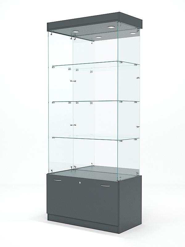 В верхней части оснащена подсветкой. Подсветка в стеклянной витрине используется для привлечения внимания потенциальных покупателей к товарам, которые находятся внутри. Она также помогает улучшить видимость товаров и создаёт уютную атмосферу в магазине.