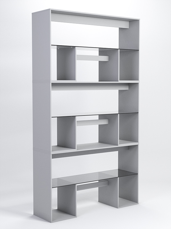 Каркас стеллажа изготавливается из ЛДСП толщиной 25 мм. Конструкция состоит из трех секций, каждая из которых содержит четыре отделения. Содержит три стеклянные полки из тонированного стекла. Цвет ЛДСП представлен в семи стандартных вариантах. Другие цвета подбираются в палитре на заказ.