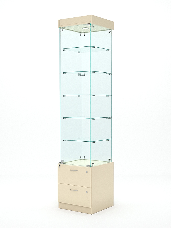 В верхней части оснащена подсветка. Подсветка в стеклянной витрине используется для привлечения внимания потенциальных покупателей к товарам, которые находятся внутри. Она также помогает улучшить видимость товаров и создаёт уютную атмосферу в магазине.