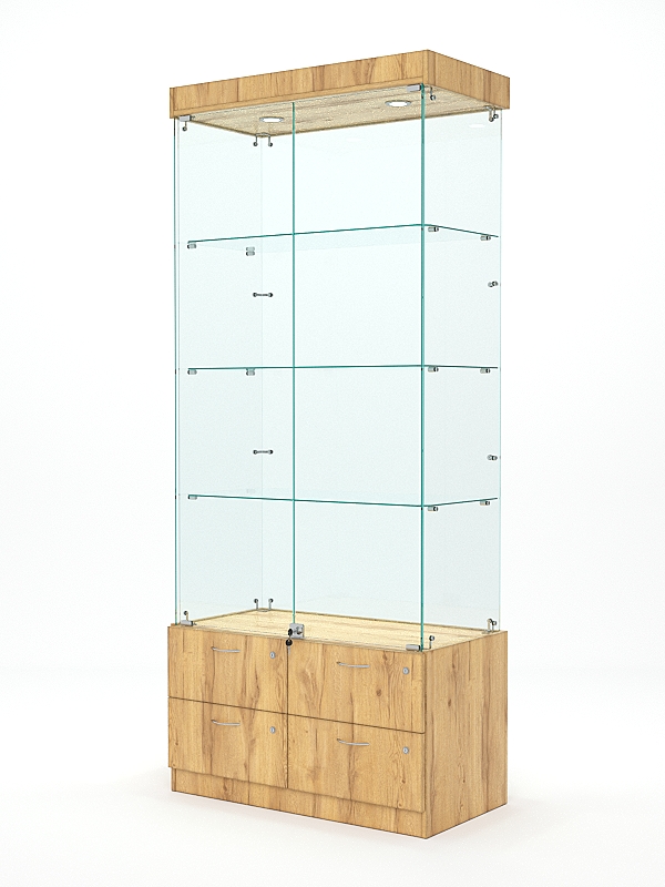 Стеклянная витрина — это конструкция из стекла, которая служит для демонстрации товаров в магазине, торговом центре или другом коммерческом объекте. Имеется три стеклянные полки. В верхней части оснащена подсветка. Материал — ЛДСП и стекло.