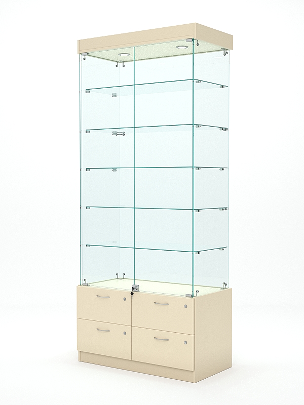 В верхней части оснащена подсветка. Подсветка в стеклянной витрине используется для привлечения внимания потенциальных покупателей к товарам, которые находятся внутри. Она также помогает улучшить видимость товаров и создаёт уютную атмосферу в магазине.