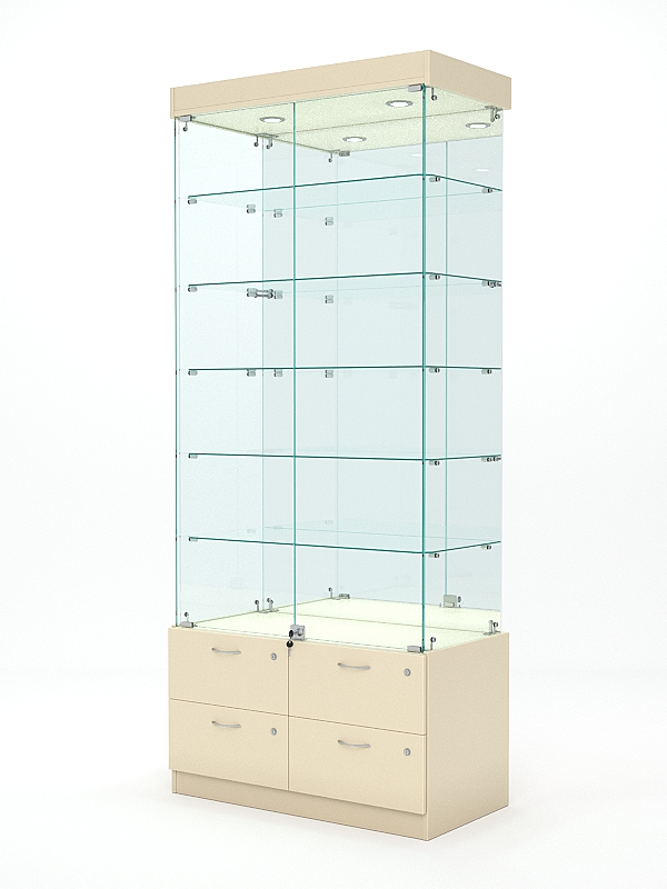 В верхней части оснащена подсветкой. Подсветка в стеклянной витрине используется для привлечения внимания потенциальных покупателей к товарам, которые находятся внутри. Она также помогает улучшить видимость товаров и создаёт уютную атмосферу в магазине.