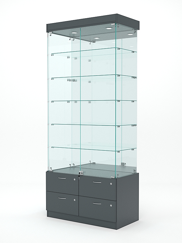 В верхней части оснащена подсветкой. Подсветка в стеклянной витрине используется для привлечения внимания потенциальных покупателей к товарам, которые находятся внутри. Она также помогает улучшить видимость товаров и создаёт уютную атмосферу в магазине.