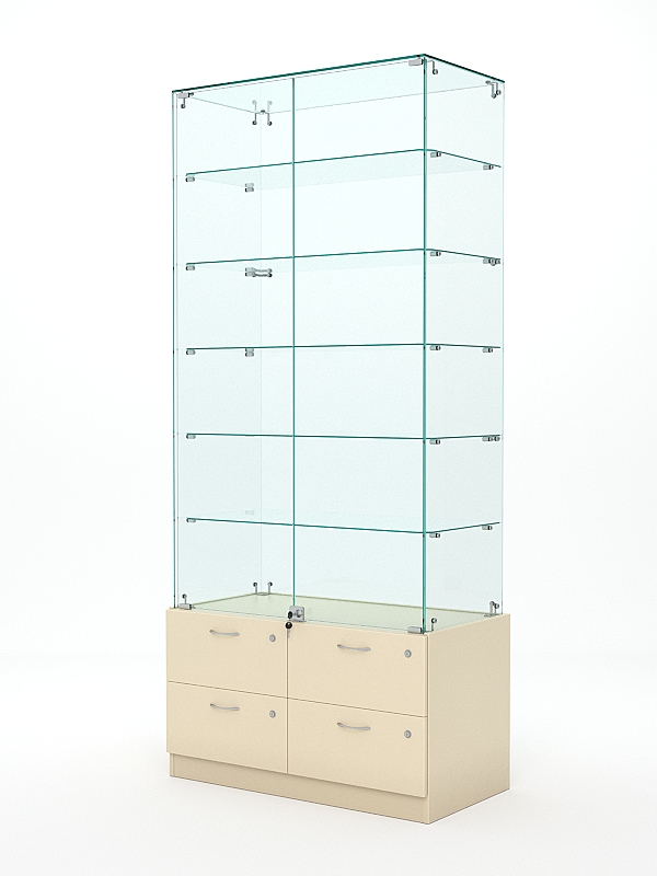 Витрины стеклянные серии «ХРУСТАЛЬ» представляют собой аналог витрин «ИСТРА» с нижним накопителем высотой 505мм, в который встроены несколько выдвижных ящиков; прозрачными боковинами и задней стенкой из стекла или зеркала. Абсолютно стеклянные по периметру варианты витрин «ХРУСТАЛЬ» позволяют потенциальному покупателю осмотреть товар, который представлен на полках витрины, со всех сторон. Витрина собирается в течение 1,5 часов и является незаменимым «помощником» в продвижении товара различных брендов.