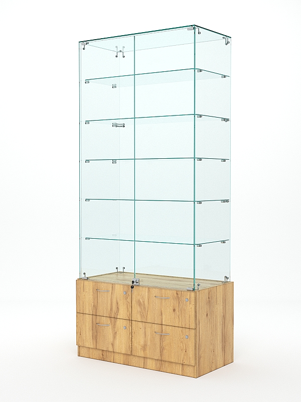 Витрины стеклянные серии «ХРУСТАЛЬ» представляют собой аналог витрин «ИСТРА» с нижним накопителем высотой 505мм, в который встроены несколько выдвижных ящиков; прозрачными боковинами и задней стенкой из стекла или зеркала. Абсолютно стеклянные по периметру варианты витрин «ХРУСТАЛЬ» позволяют потенциальному покупателю осмотреть товар, который представлен на полках витрины, со всех сторон. Витрина собирается в течение 1,5 часов и является незаменимым «помощником» в продвижении товара различных брендов.