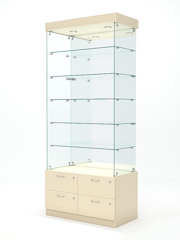 В верхней части оснащена подсветкой. Подсветка в стеклянной витрине используется для привлечения внимания потенциальных покупателей к товарам, которые находятся внутри. Она также помогает улучшить видимость товаров и создаёт уютную атмосферу в магазине.