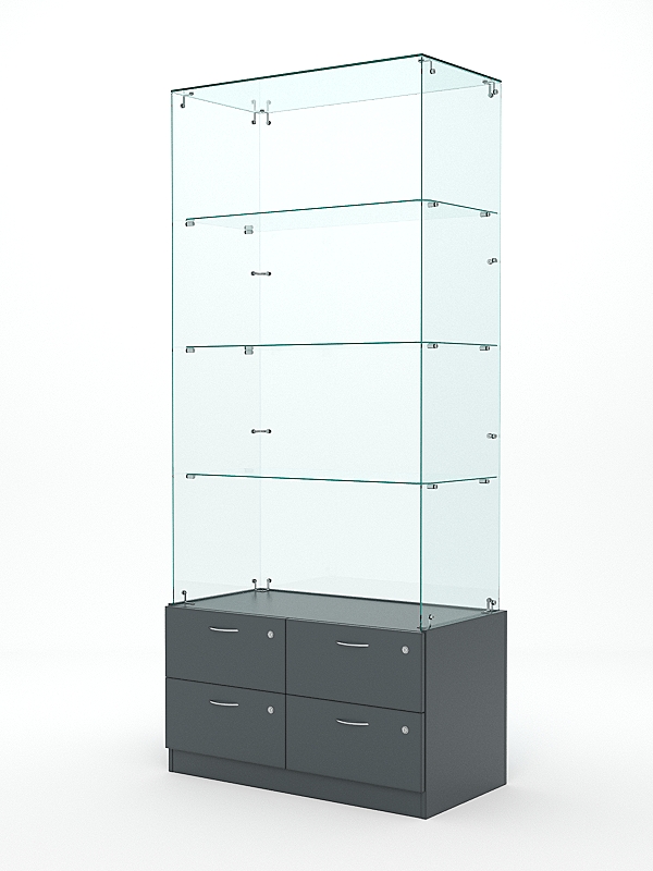 Витрины стеклянные серии «ХРУСТАЛЬ» представляют собой аналог витрин «ИСТРА» с нижним накопителем высотой 505мм, в который встроены несколько выдвижных ящиков; прозрачными боковинами и задней стенкой из стекла или зеркала. Абсолютно стеклянные по периметру варианты витрин «ХРУСТАЛЬ» позволяют потенциальному покупателю осмотреть товар, который представлен на полках витрины, со всех сторон. Витрина собирается в течение 1,5 часов и является незаменимым «помощником» в продвижении товара различных брендов.