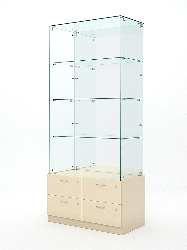 Витрины стеклянные серии «ХРУСТАЛЬ» представляют собой аналог витрин «ИСТРА» с нижним накопителем высотой 505мм, в который встроены несколько выдвижных ящиков; прозрачными боковинами и задней стенкой из стекла или зеркала. Абсолютно стеклянные по периметру варианты витрин «ХРУСТАЛЬ» позволяют потенциальному покупателю осмотреть товар, который представлен на полках витрины, со всех сторон. Витрина собирается в течение 1,5 часов и является незаменимым «помощником» в продвижении товара различных брендов.