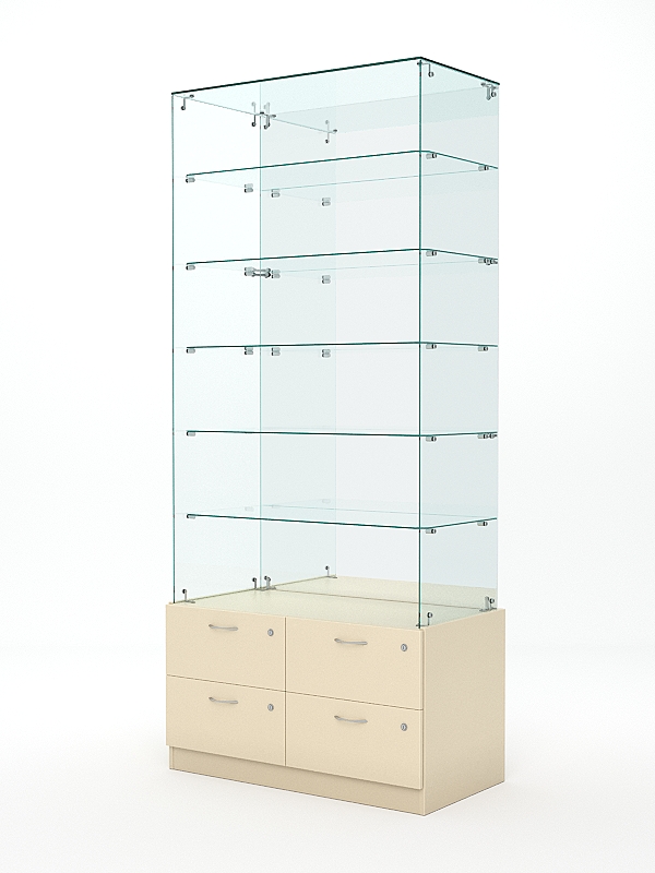 Витрины стеклянные серии «ХРУСТАЛЬ» представляют собой аналог витрин «ИСТРА» с нижним накопителем высотой 505мм, в который встроены несколько выдвижных ящиков; прозрачными боковинами и задней стенкой из стекла или зеркала. Абсолютно стеклянные по периметру варианты витрин «ХРУСТАЛЬ» позволяют потенциальному покупателю осмотреть товар, который представлен на полках витрины, со всех сторон. Витрина собирается в течение 1,5 часов и является незаменимым «помощником» в продвижении товара различных брендов.