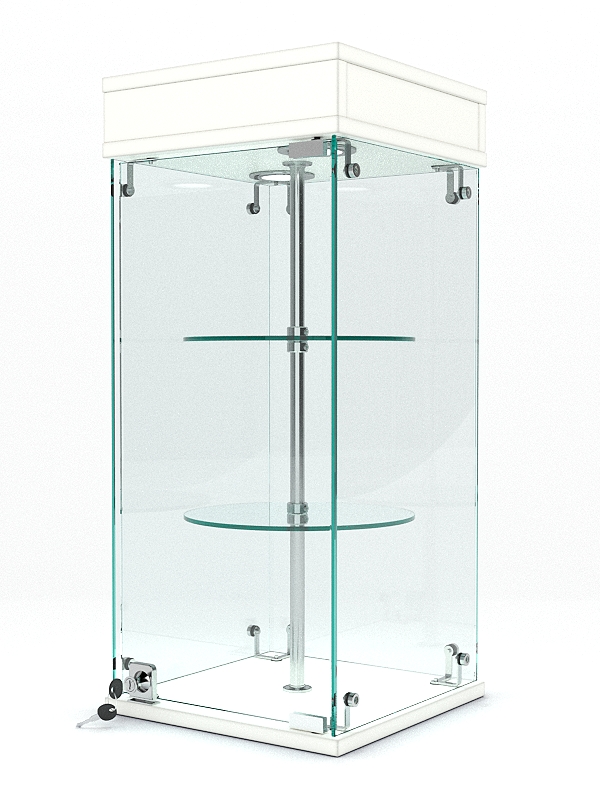 Конструкция содержит 2 стеклянные полки. Спереди расположена распашная дверка с замком. Корпус стеклянный. Подиум и фриз изготовлены из ЛДСП. В фризе установлена подсветка.