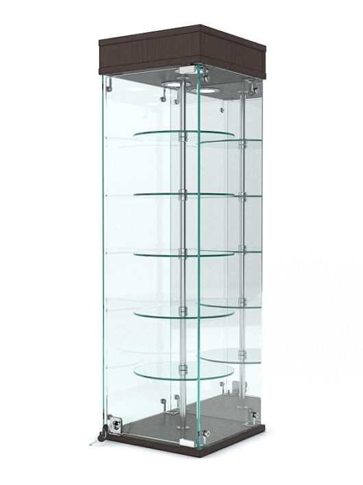 Конструкция содержит 5 стеклянных полок. Спереди расположена распашная дверка с замком. Корпус стеклянный. Подиум и фриз изготовлены из ЛДСП. Зеркальная задняя стенка делает витрину более эффектной и обеспечивает красивую экспозицию товару. В фризе установлена подсветка.