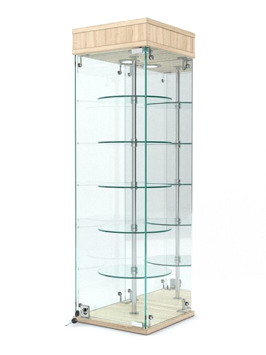 Конструкция содержит 5 стеклянных полок. Спереди расположена распашная дверка с замком. Корпус стеклянный. Подиум и фриз изготовлены из ЛДСП. Зеркальная задняя стенка делает витрину более эффектной и обеспечивает красивую экспозицию товару. В фризе установлена подсветка.