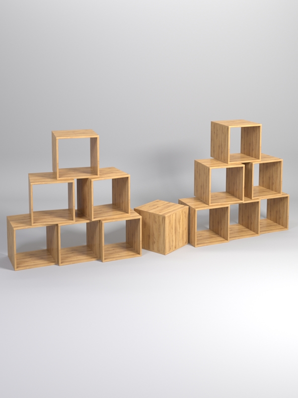 Модули серии Куб производятся из качественной ДСП различных цветов. Модули могут комбинироваться в любом порядке, что позволяет создавать оригинальные конструкции. Благодаря универсальной форме в виде куба, в модуле можно разместить любые предметы: одежду, сумки, украшения для дома, книги, мелкие аксессуары.