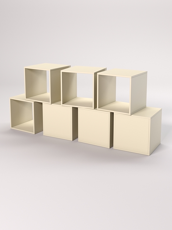 Модули серии Куб производятся из качественной ДСП различных цветов. Модули могут комбинироваться в любом порядке, что позволяет создавать оригинальные конструкции. Благодаря универсальной форме в виде куба, в модуле можно разместить любые предметы: одежду, сумки, украшения для дома, книги, мелкие аксессуары.