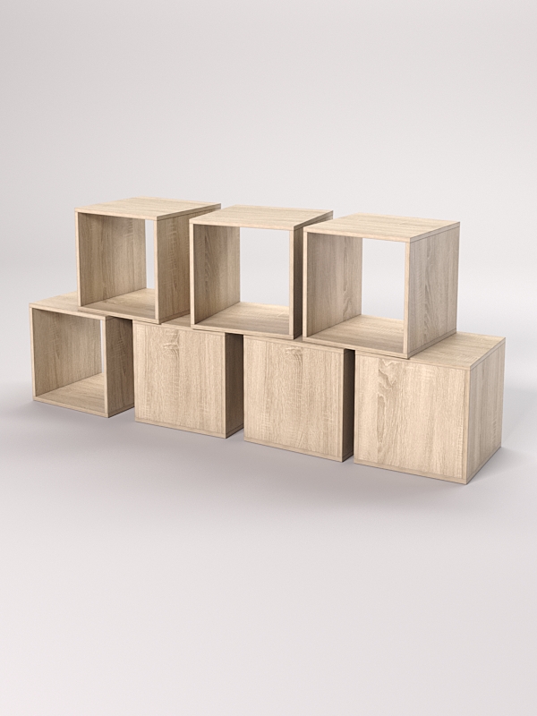 Модули серии Куб производятся из качественной ДСП различных цветов. Модули могут комбинироваться в любом порядке, что позволяет создавать оригинальные конструкции. Благодаря универсальной форме в виде куба, в модуле можно разместить любые предметы: одежду, сумки, украшения для дома, книги, мелкие аксессуары.