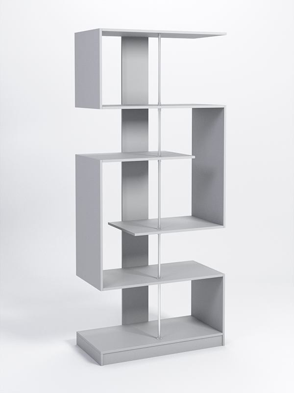 Данный стеллаж является полностью открытым. Каркас выполнен из ДСП и металла. Конструкция содержит 5 полок. Между собой полки соединяются попарно с помощью ДСП-панелей. Возможно изготовление стеллажа в любом из семи указанных в палитре цветов.