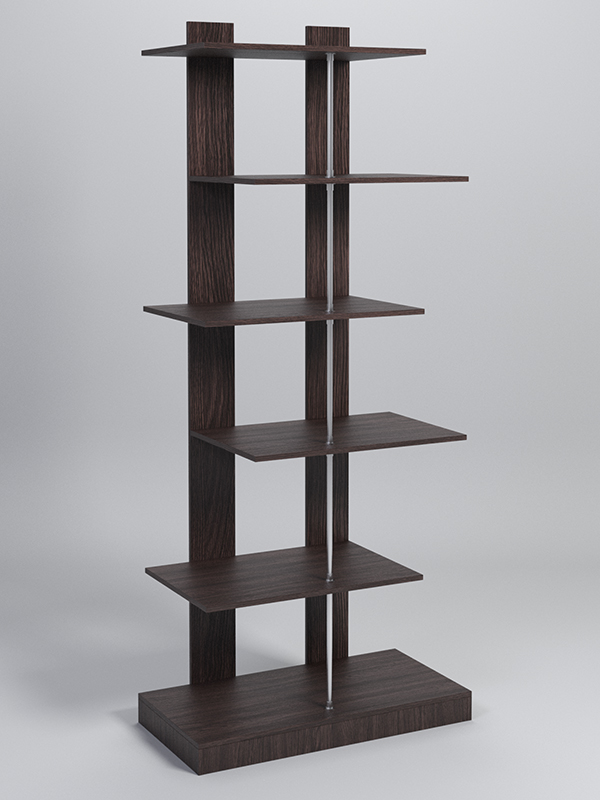 Открытый стеллаж с 5-ю полками. В основании крепятся две вертикальные планки, имитирующие заднюю стенку, и металлический стержень с полками.