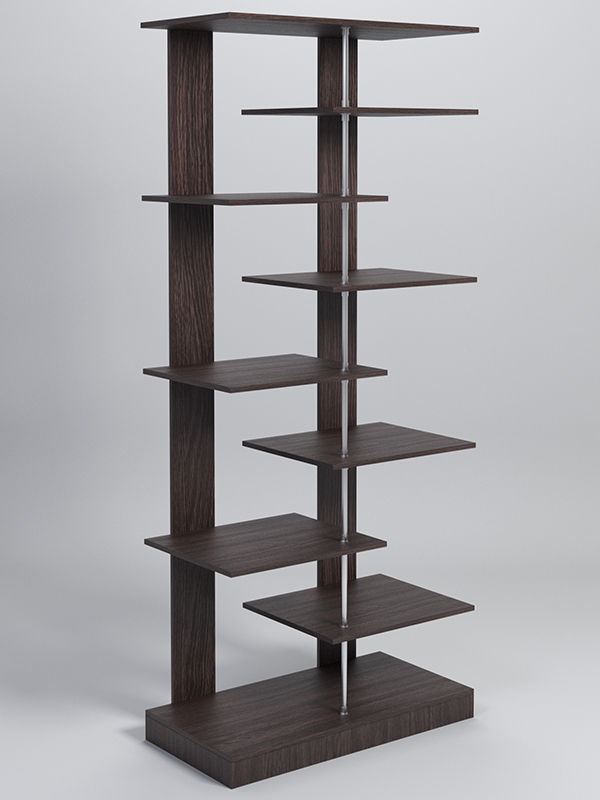 Данный стеллаж является полностью открытым. Конструкция содержит 7 полок. Полки крепятся к металлическому стержню и к двум вертикальным планкам. Каркас выполнен из ДСП и металла. Возможно изготовление стеллажа в любом из семи указанных в палитре цветов.