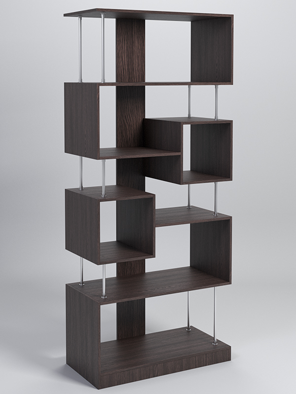 Стеллажи серии Куб представляют собой вертикальную стойку с каркасом из ДСП. Основание и крыша стеллажа соединяются посредством вертикальной планки. Полки крепятся на металлический стержень. С основной конструкцией полки соединяются по задней кромке. Такие конструкции выглядят очень необычно и эффектно.