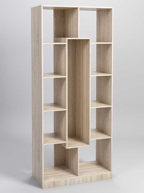 Каркас выполнен из ДСП. Конструкция состоит из 3 секций. Центральная секция содержит 3 полки, боковые — 4 полки. Вертикальная планка из ДСП служит задней стенкой центральной секции. Возможно изготовление стеллажа в любом из семи указанных в палитре цветов.