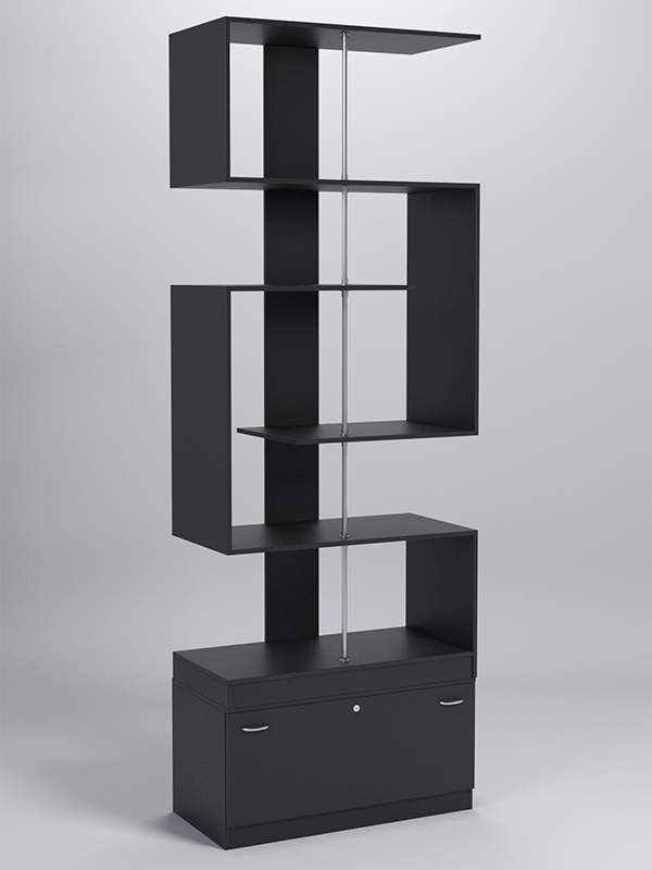Данный стеллаж содержит пять полок и тумбу с выдвижным ящиком. Заднюю стенку имитирует вертикальная планка. Полки нанизаны на металлический стержень, соединяющий крышу с основанием. Между собой полки соединяются попарно, образуя частично боковые стенки. Каркас выполнен из ЛДСП. Имеется семь стандартных расцветок. Другие цвета подбираются в палитре на заказ.