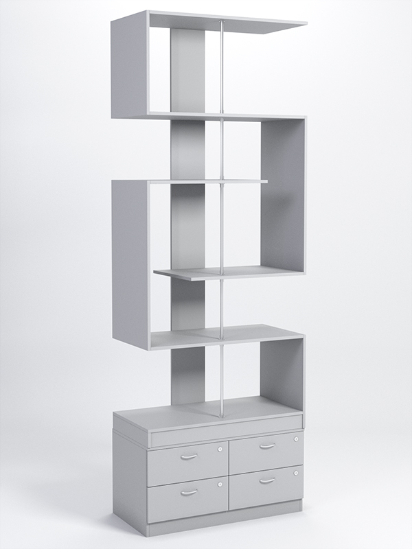 Данный стеллаж содержит пять полок и тумбу с четырьмя выдвижными ящиками. Заднюю стенку имитирует вертикальная планка. Полки нанизаны на металлический стержень, соединяющий крышу с основанием. Между собой полки соединяются попарно, образуя частично боковые стенки. Каркас выполнен из ЛДСП. Имеется семь стандартных расцветок. Другие цвета подбираются в палитре на заказ.
